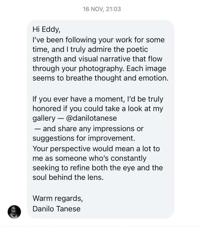 I have been admiring your wonderful images for a number of years, and I was wondering if you would be interested in making a presentation to our club in the coming months? The presentation would be in English and would most likely be online. It could cover topics such as how you started in photography, how you approach each image, your processing approach etc. and would be accompanied by a selection of your images. (These are, of course, suggestions only).